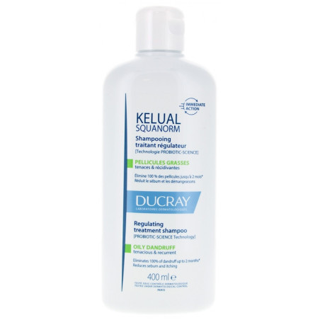 Ducray Kelual Squanorm Shampoing Traitant Régulateur Pellicules Grasses 400 ml est formulé pour agir immédiatement sur les pellicules tenaces et récidivantes.