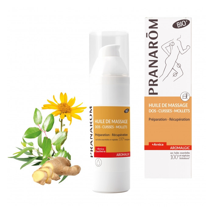 Pranarôm Aromalgic Huile de Massage Bio Dos-Cuisses-Mollets 100 ml est une huile de massage idéale pour un massage de préparation à l'effort physique ou en massage détente pour une récupération optimale. Certifiée Bio*, elle est formulée à base d'huiles essentielles de gaultherie, d'eucalyptus citronné, de gingembre, de romarin à camphre, de thym à bornéol et d'extrait d'Arnica pour un massage réconfortant.