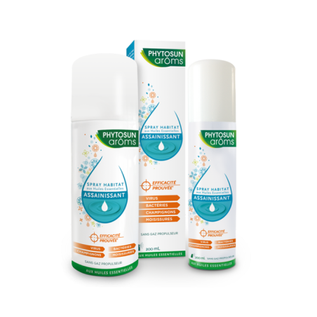 Spray habitat assainissant de Phytosun Arôms, aux huiles essentielles, il peut être utilisé quotidiennement dans toutes les pièces de la maison, sur les tapis, les matelas…, et à l’occasion du grand nettoyage de printemps.