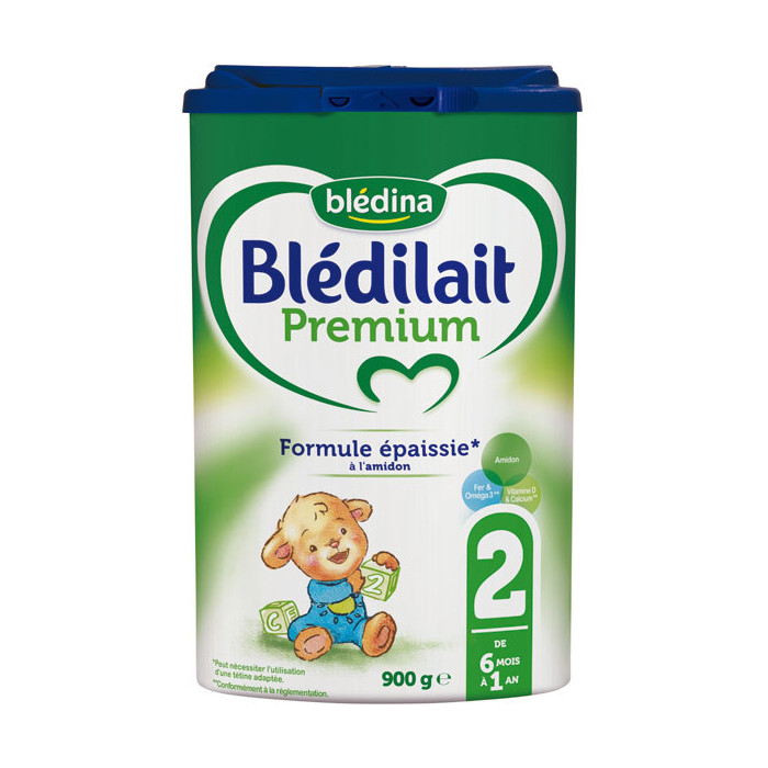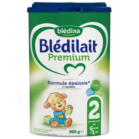 Blédilait Premium 2 900g, une formule épaissie à l'amidon qui répond aux besoins spécifiques des nourrissons de 6 à 12 mois, conformément à la réglementation, dans le cadre d'une alimentation diversifiée.
