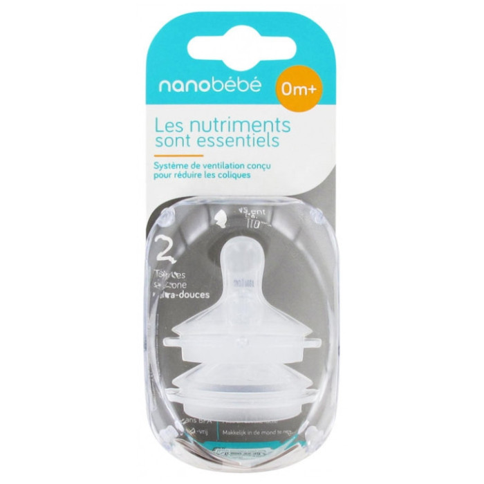 Béaba Nanobébé 2 Tétines Silicone Débit Lent 0 Mois et + sont dotées d'un système de ventilation conçu pour réduire les risques de coliques.