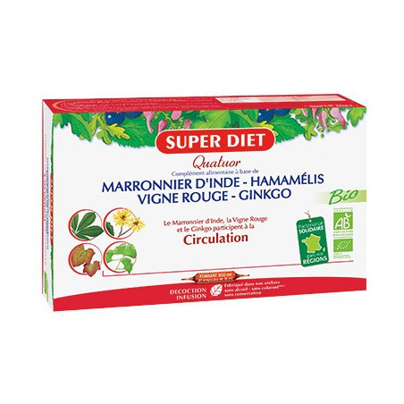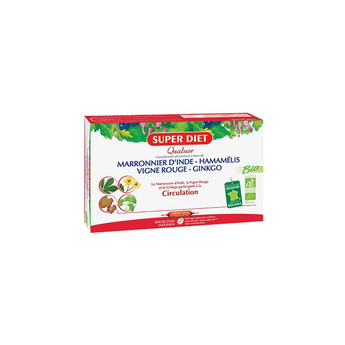 Super Diet Quatuor Vigne Rouge Circulation Bio 20 Ampoules est un extrait fluide à base de Marronnier d'Inde, Hamamélis, Vigne Rouge, Ginkgo.- la vigne rouge aide à réduire la sensation de jambes lourdes,- le marronnier d'inde contribue au maintien d'un système circulatoire normal,- le ginkgo favorise une bonne circulation,- l'hamamélis complète à merveille cette formule.