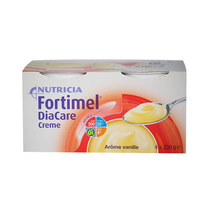 Aliment diététique destiné à des fins médicales spéciales pour les besoins nutritionnels en cas de dénutrition associée à des troubles du métabolisme glucidique. Fortimel® DiaCare Creme est un complément nutritionnel oral hyperprotidique, hyperénergétique, avec fibres, isomaltulose et édulcorants. Sans saccharose. Sans gluten. Conditionné sous atmosphère protectrice. Stérilisé UHT.