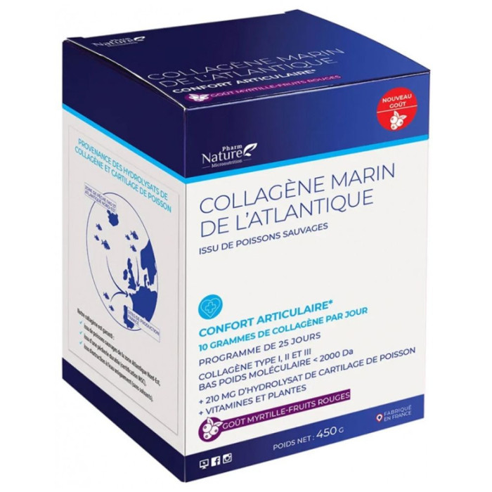 Pharm Nature Collagène Marin de L'Atlantique Confort Articulaire 450 g est un complément alimentaire aromatisé avec édulcorants sous forme de poudre pour le confort articulaire.
