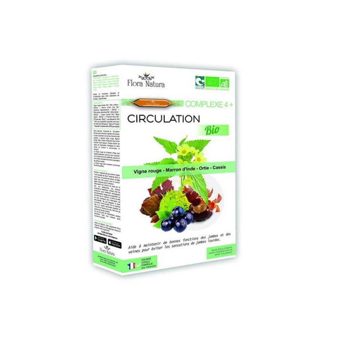 Flora Natura Complexe 4+ Bio Circulation favorise la fonction capillaire de la peau, aide à maintenir de bonnes fonctions jambe. Il associe vigne rouge, marron d'Inde, ortie, Cassis , primevère sous forme d’extraits fluides aqueux. Chaque plante est issue de l’agriculture biologique et nos synergies d’extraits ne contiennent ni conservateur, ni colorant.
