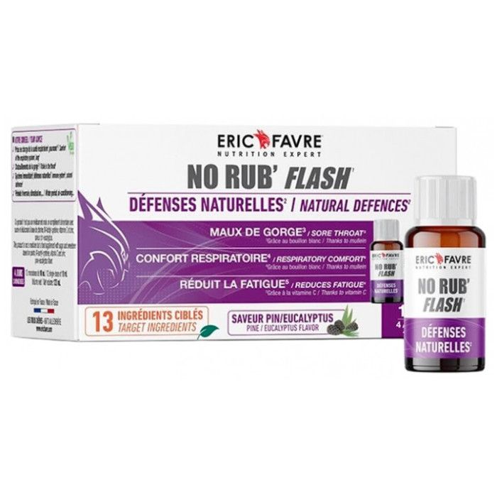Eric Favre No Rub' Flash Gênes Hivernales 12 Shots est un complément alimentaire avec sucre et édulcorant, à base de plantes, N-acétyl-cystéine, vitamine C et zinc. Composé de 13 ingrédients ciblés (dont le pélargonium), il a été développé pour agir sur un large spectre :