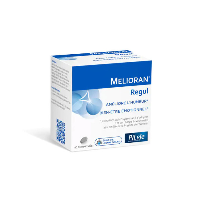 Melioran Regul complément alimentaire des Laboratoires Pileje, à base de rhodiole et d'extrait Safracetin de safran pour aider à améliorer l'humeur et apporter un bien-être émotionnel.