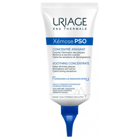Uriage Xémose PSO Concentré Apaisant 150 ml est un soin visage et corps destiné aux peaux à tendance psoriasique.Il est conçu pour calmer les sensations de démangeaisons et renforcer la barrière cutanée en associant l'Eau Thermale d'Uriage et deux brevets dermatologiques :