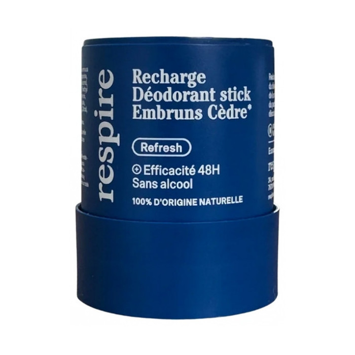 - Ce produit recharge Respire Déodorant Stick Embruns Cèdre 50 g. Sans alcool. 100% d'origine naturelle. Vegan.