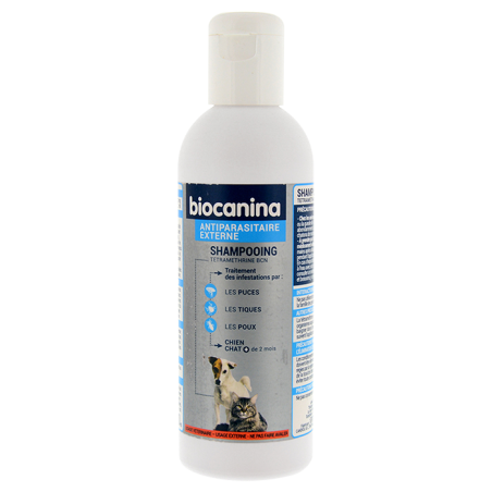 Biocanina Shampooing Antiparasitaire Externe est un shampooing traitant des infestations par les puces, les tiques et les poux. Il convient aux chiens et aux chats de plus de 2 mois.