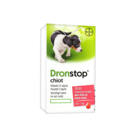 Bayer Dronstop Chiot Suspension Buvable 50 ml est une suspension buvable, vermifuge contre les vers ronds.Chez les chiots et les jeunes chiens jusqu'à l'âge d'un an, ce vermifuge traite les infestations par les nématodes (ascaris, ankylostomes ou trichures).Cette boîte contient : 1 flacon de 50 ml avec 1 seringue graduée de 5 ml.