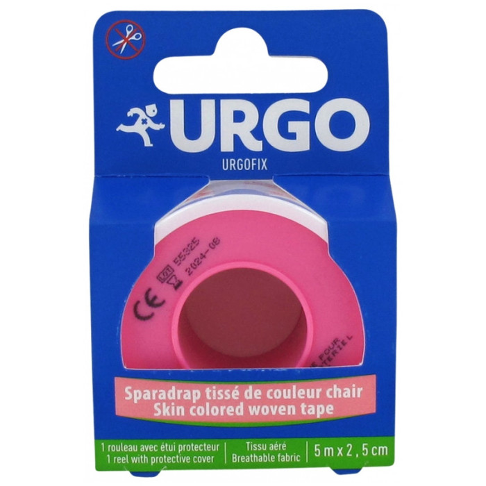 Urgo Fix Sparadrap Tissé de Couleur Chair 5 m x 2,5 cm est un dispositif médical indiqué pour la fixation et le maintien de pansements ou dispositifs, en particulier sur zone de frottements ou de traction. C'est un tissu aéré en rouleau avec étui protecteur.