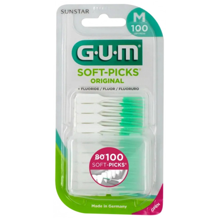 GUM Soft-Picks Original Medium 100 Unités sont des bâtonnets interdentaires en caoutchouc et au fluor qui éliminent facilement et efficacement la plaque et les résidus alimentaires.