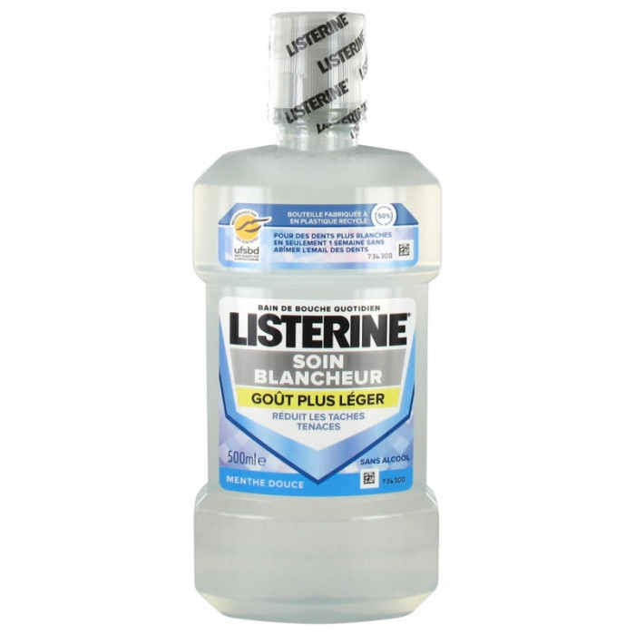 Listerine Bain de Bouche Soin Blancheur Goût Plus Léger 500 ml est un bain de bouche quotidien sans alcool, qui s'utilise en complément du brossage. Il contient :