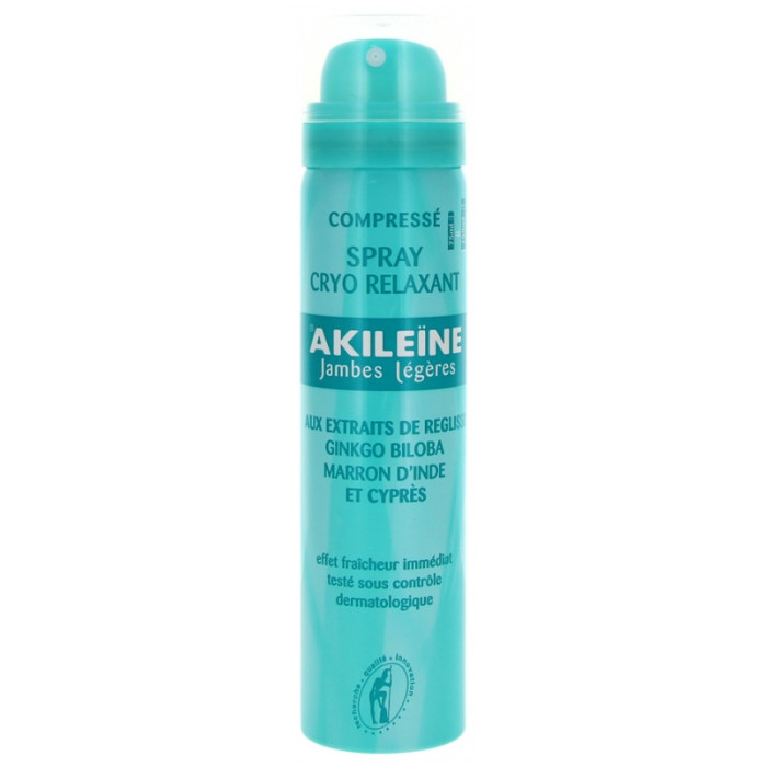 Akileïne Spray Cryo Relaxant Jambes Légères 75 ml est un spray aux extraits de racine de réglisse, de ginkgo biloba, de marron d'Inde et de cyprès qui conjuguent leurs effets bénéfiques avec l'intense fraîcheur du menthol.