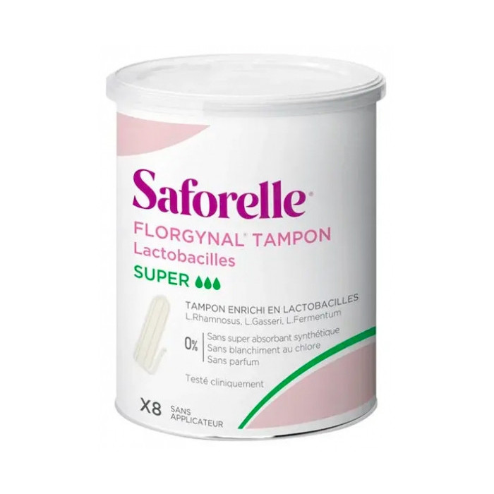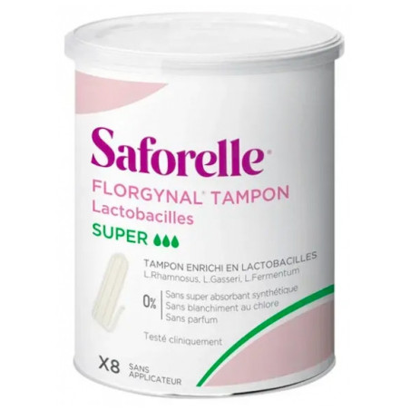 Saforelle Florgynal Tampon 8 Super est un tampon qui absorbe les flux menstruels.Il contient un cordon d'extraction en coton.Le tampon libère des probiotiques Lactobacilles : L.Rhamnosus, L.Gasseri, L.Fermentum pour rééquilibrer votre flore vaginale.