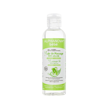 L'huile de massage Bio 100% naturelle d'Alphanova Bébé est un soin hydratant et apaisant, sans parfum, certifié biologique, pour l'hydratation ou le massage de la peau de bébé et de vos enfants.