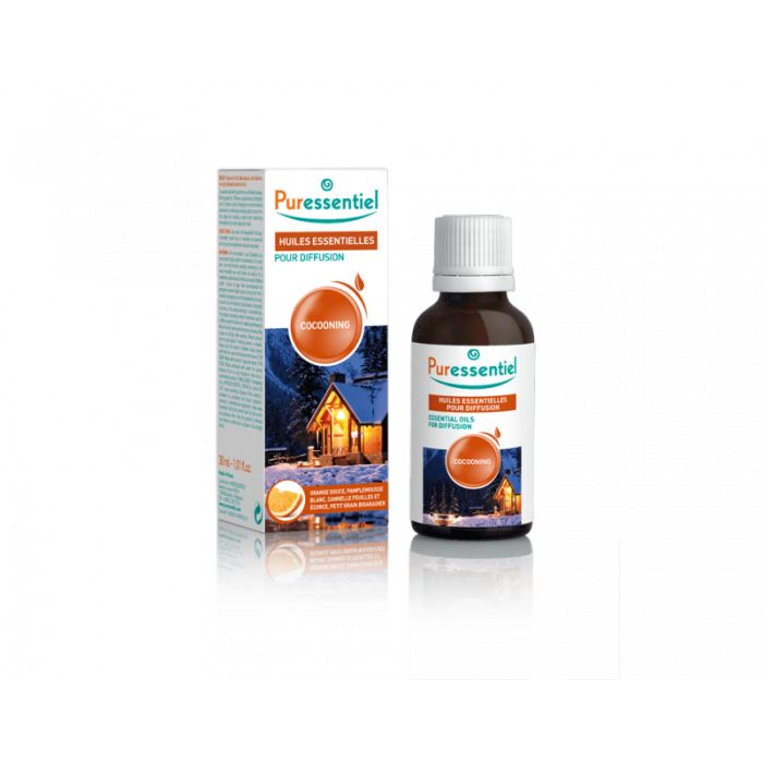 Puressentiel Huile Essentielle pour Diffusion Cocooning 30 ml est une huile essentielle pour diffusion, idéale pour se relaxer et pour passer un moment de cocooning, bien au chaud. Cette huile essentielle pour diffusion associe 5 huiles essentielles : orange douce, pamplemousse blanc, cannelle de chine feuilles, petit grain bigaradier et cannelle de Ceylan écorce. Ne pas utiliser en présence d'un enfant de moins de 3 ans, d'une femme enceinte ou allaitante, en présence d'une personne ayant des antécédents de troubles convulsifs ou épileptiques.
