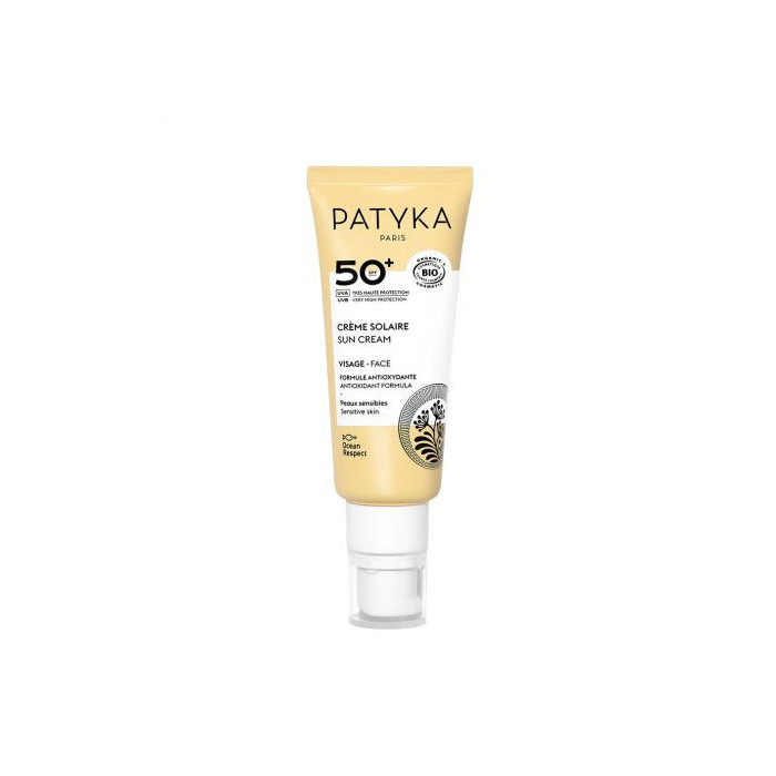 - Patyka crème solaire bio SPF 50+ est dotée de filtres minéraux naturels ne contenant pas de nanoparticules. Elle est efficace contre les UVA et les UVB, assurant une très haute protection. Elle contient également de la m