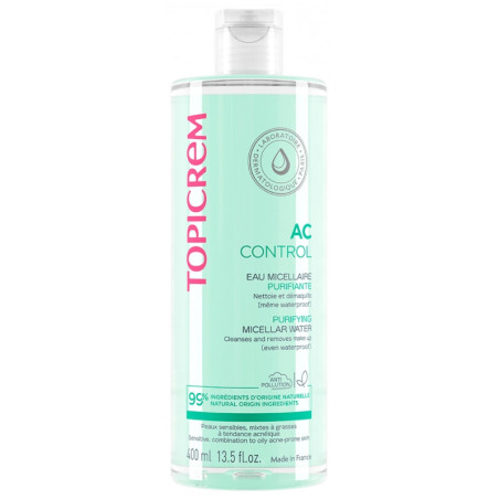 Topicrem AC Eau Micellaire Purifiante 400 ml est une eau micellaire qui nettoie et démaquille les yeux sensibles et peaux sensibles mixtes à grasses à tendance acnéique.