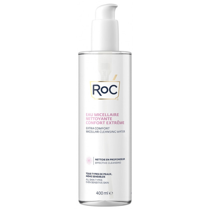 RoC Eau Micellaire Nettoyante Confort Extrême 400 ml est une eau qui offre un nettoyage doux et efficace avec une tolérance optimale.La peau est instantanément plus propre, plus douce et plus lisse.