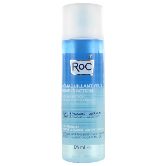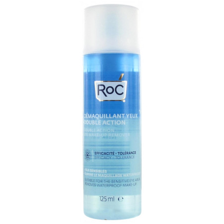 RoC Démaquillant Yeux Double Action 125 ml est un démaquillant pour les yeux qui élimine le maquillage waterproof.Grâce à sa combinaison unique d'eau et d'huile, il enlève les traces de maquillage les plus tenaces, même waterproofs, tout en respectant la zone sensible du contour de l'œil.