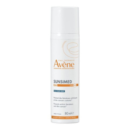 Avène SunsiMed KA SPF 50+ est un dispositif médical de très haute protection destinée aux personnes présentant un risque élevé de kératose actinique en cas d'exposition au soleil. Son efficacité a été démontrée contre les effets néfastes des rayons UVA et UVB, et notamment contre le photo-vieillissement et les dommages cellulaires pouvant provoquer, à terme, des cancers cutanés.